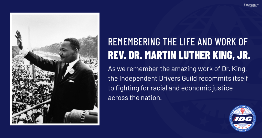 On Martin Luther King Jr. Day, the Independent Drivers Guild honors Dr. King’s legacy by recommitting ourselves to the fight for racial justice and dignity for working people. Dr. King understood that civil rights and workers’ rights are inseparable, and his call for economic justice still rings true for the app-based drivers who keep our cities moving, many of whom are immigrants and people of color. From winning fair pay and protections on the job to standing up for basic dignity like restroom access and protected breaks, IDG’s work reflects the same belief that every worker deserves respect, safety, and a real voice. As we reflect on Dr. King’s legacy, we are reminded that the struggle for justice is ongoing, and that together, we can continue bending the arc toward fairness.
