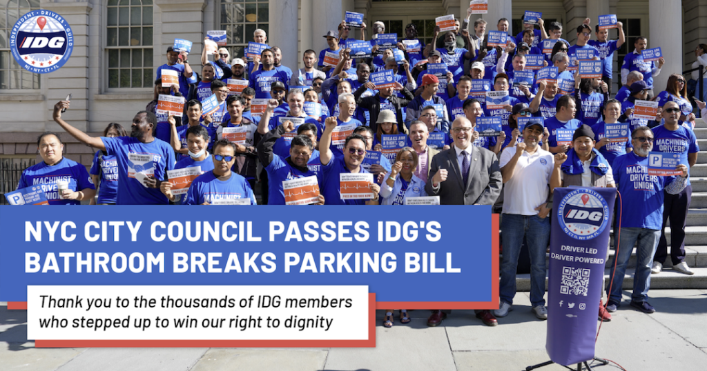 We won! The Independent Drivers Guild successfully championed Intro 1000, a New York City Council bill that now guarantees basic bathroom access and legally protected break time for for-hire vehicle drivers. After years of drivers being forced to ration water and endure long hours without restroom access, this win addressed a critical health and safety issue in a job that keeps workers behind the wheel all day.