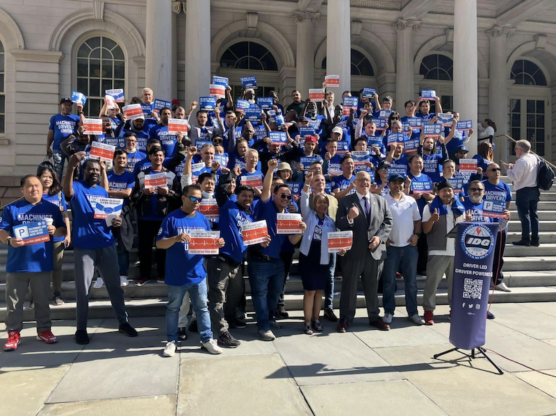 About 100 IDG members (rideshare drivers) gathered on the steps of City Hall September 15th with bill sponsor Council Member Justin Brannan and co-sponsoring Council Members to rally for the legislation ahead of a 10 AM hearing on the bill. IDG Members, clad in bright blue shirts, also filled City Council Chambers, overflowing to the balcony to support the bill. Intro 1000 Co-sponsors include: Amanda Farías, Mercedes Narcisse, Chris Banks, Gale A. Brewer, Sandy Nurse, Chi A. Ossé, Farah N. Louis, and Susan Zhuang. Many Guild members waved signs with calls to action for the city leaders such as “Breaks Are a Right, Not a Luxury” and “We Drive the City – Let Us Take a Break”.